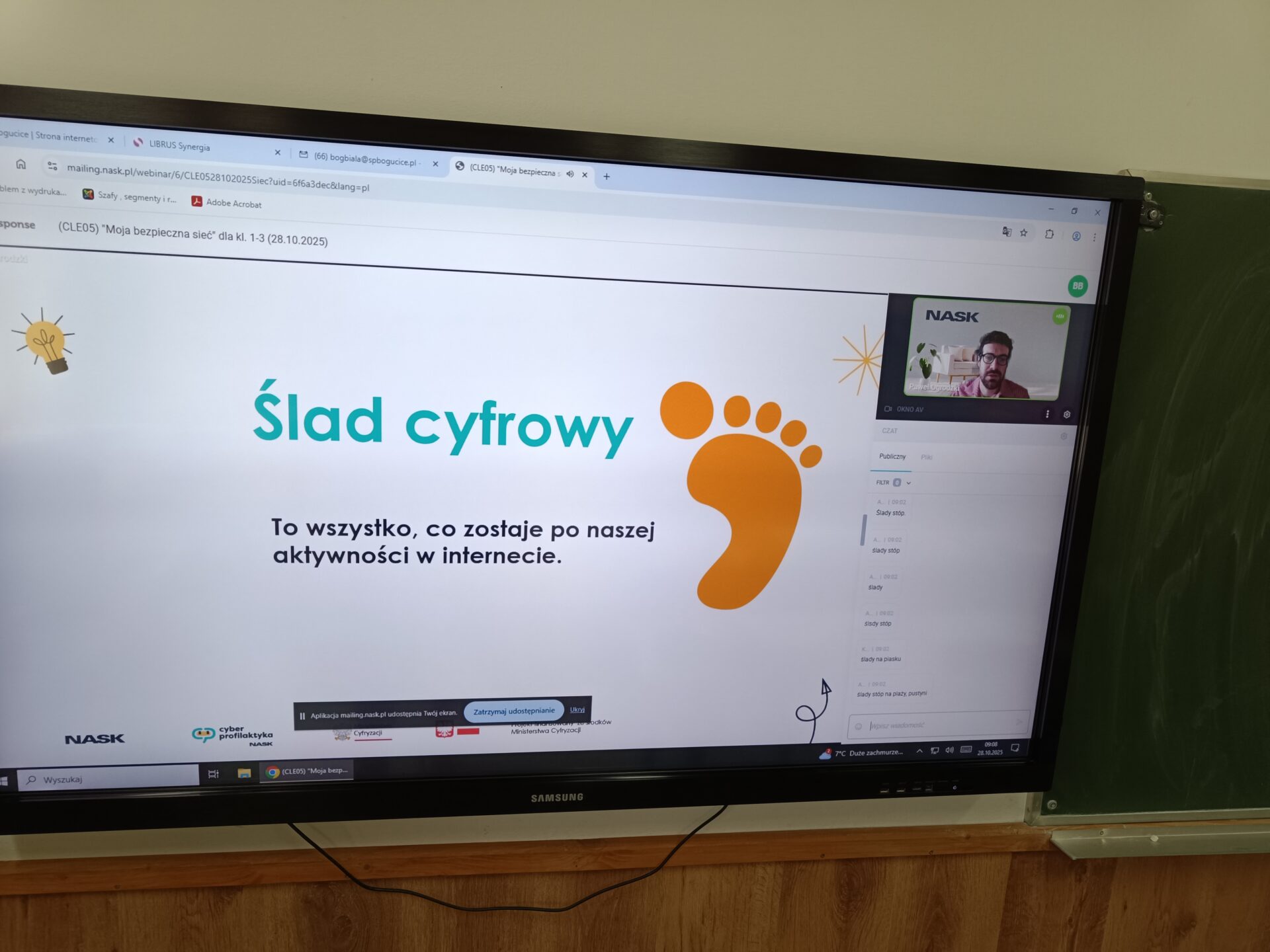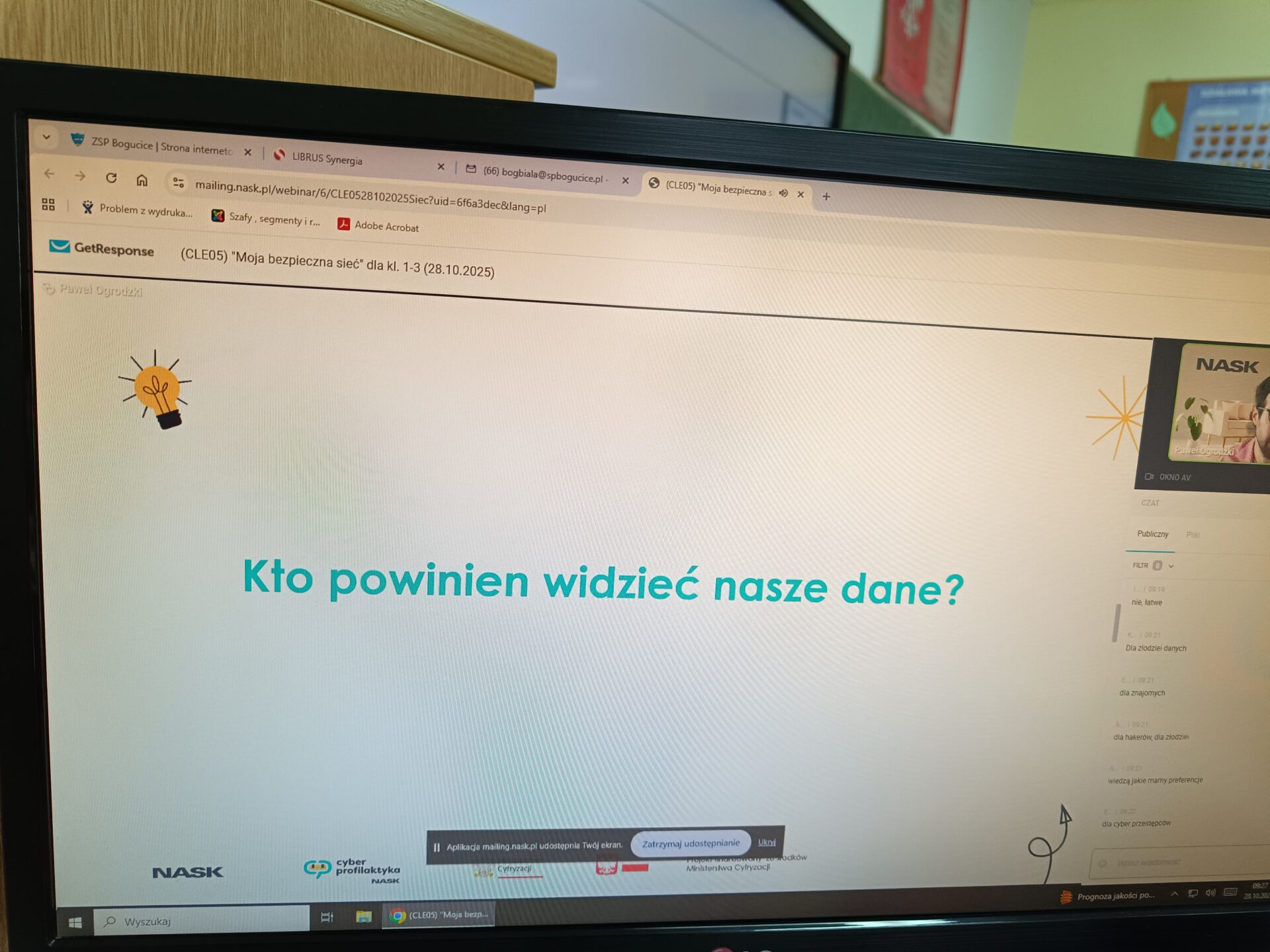 28 pażdziernika uczniowie klas I-III po raz drugi wzięli udział w webinariumpt „Moja bezpieczna sieć ”. Ta lekcja przybliżyła nam podstawy prywatności w sieci ,potrzebę dbałości o swoje dane oraz stosowanie ograniczonego zaufania względem znajomych z Internetu.