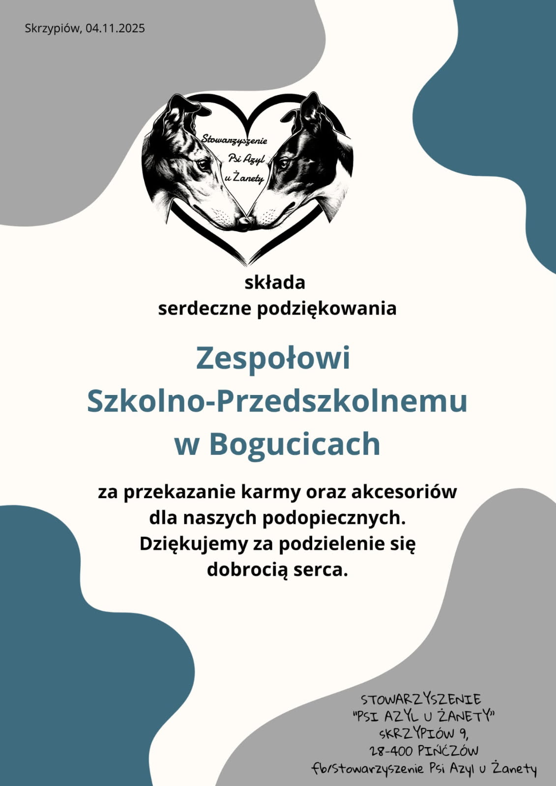 Szkolne Koło Wolontariatu przy Zespole Szkolno-Przedszkolnym w Bogucicach po raz kolejny zorganizowało zbiórkę na rzecz potrzebujących zwierząt. Dzięki zaangażowaniu uczniów, rodziców i nauczycieli udało się zebrać karmę dla psów oraz pluszaki, które trafiły do Stowarzyszenia „Psi Azyl u Żanety”.