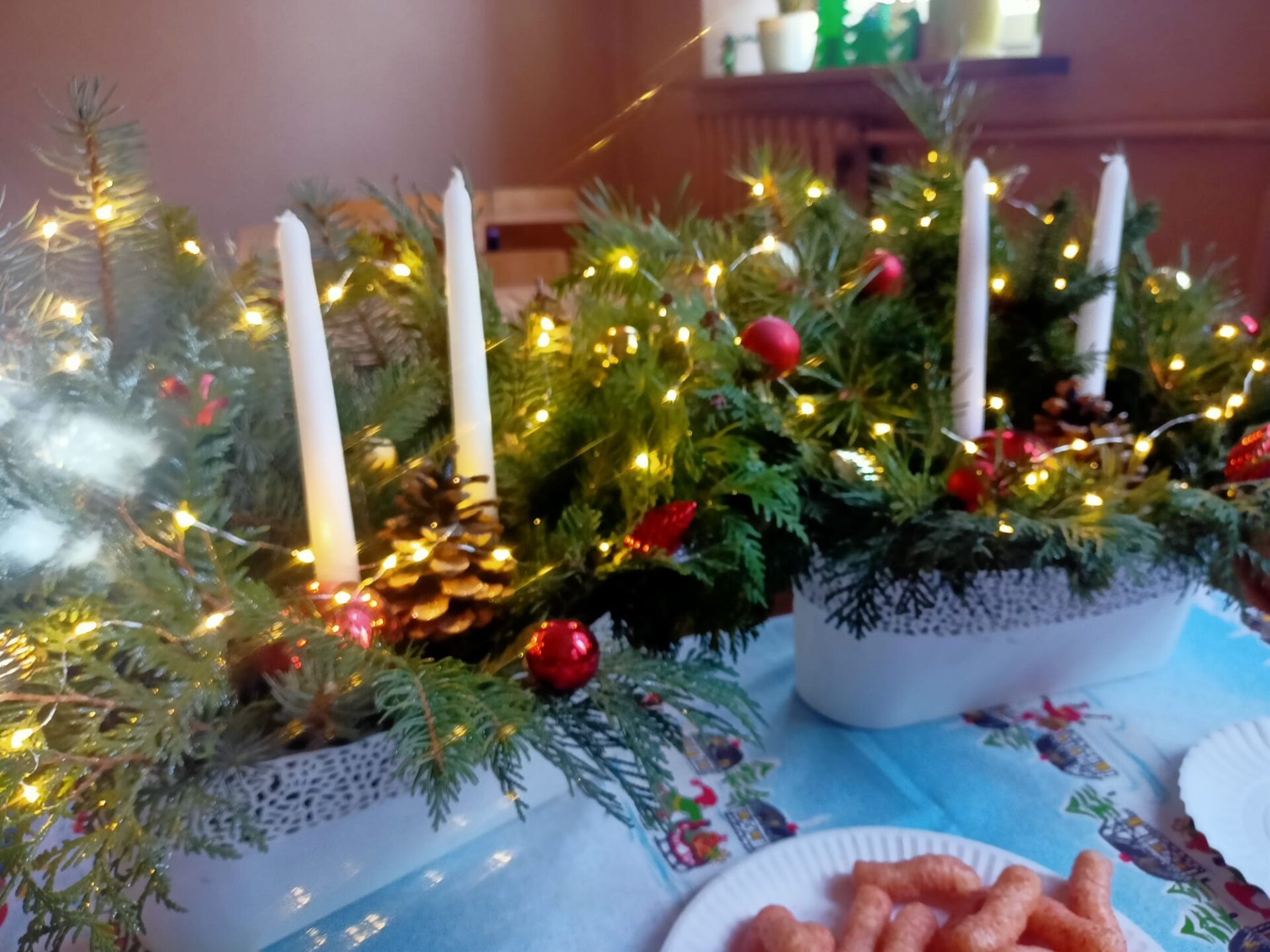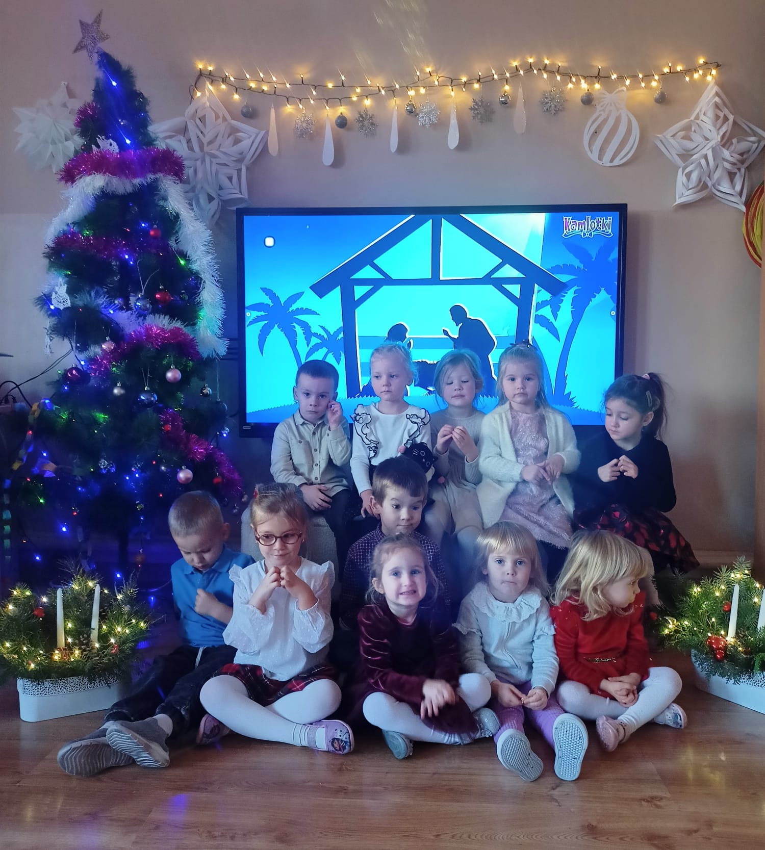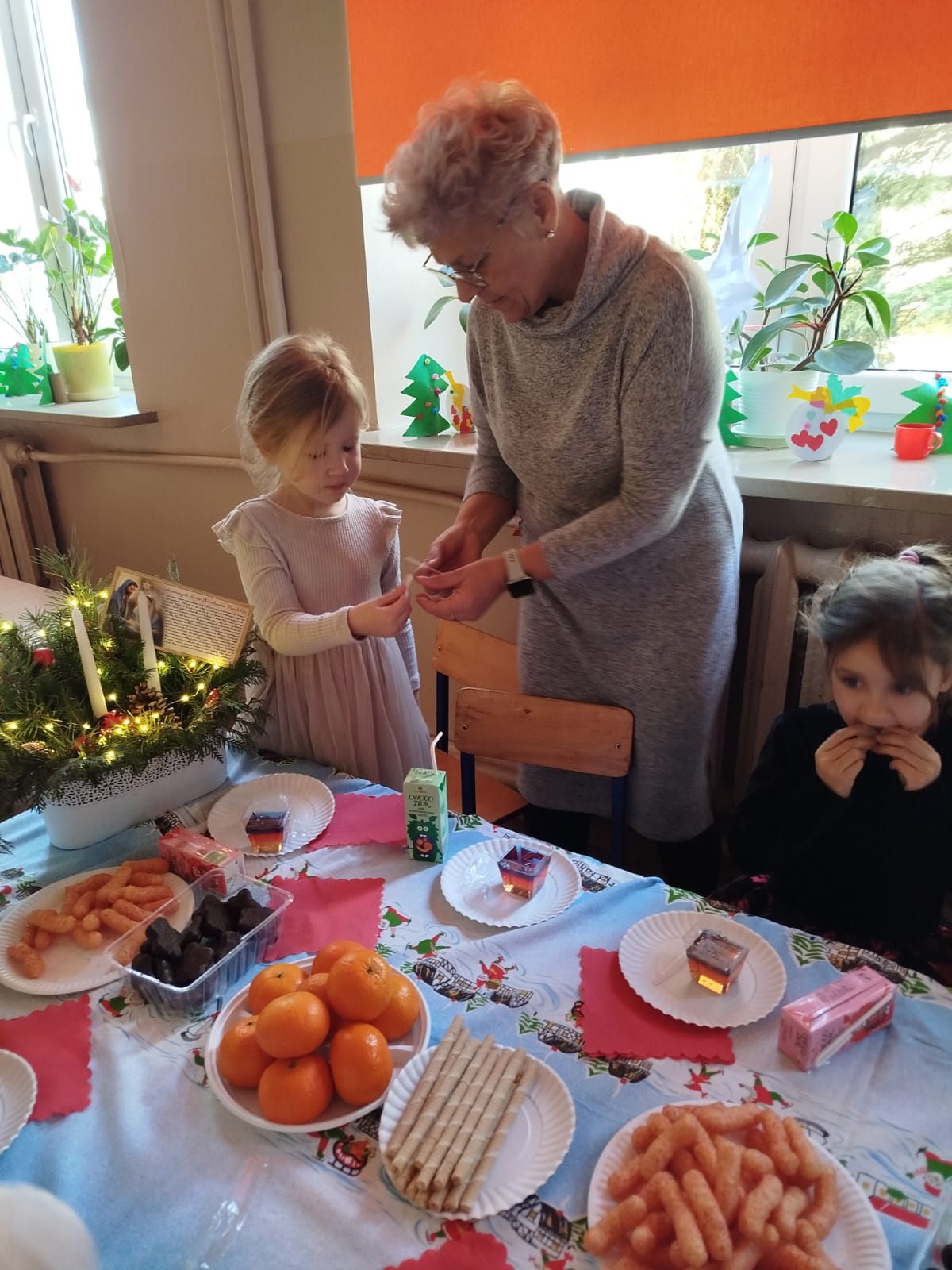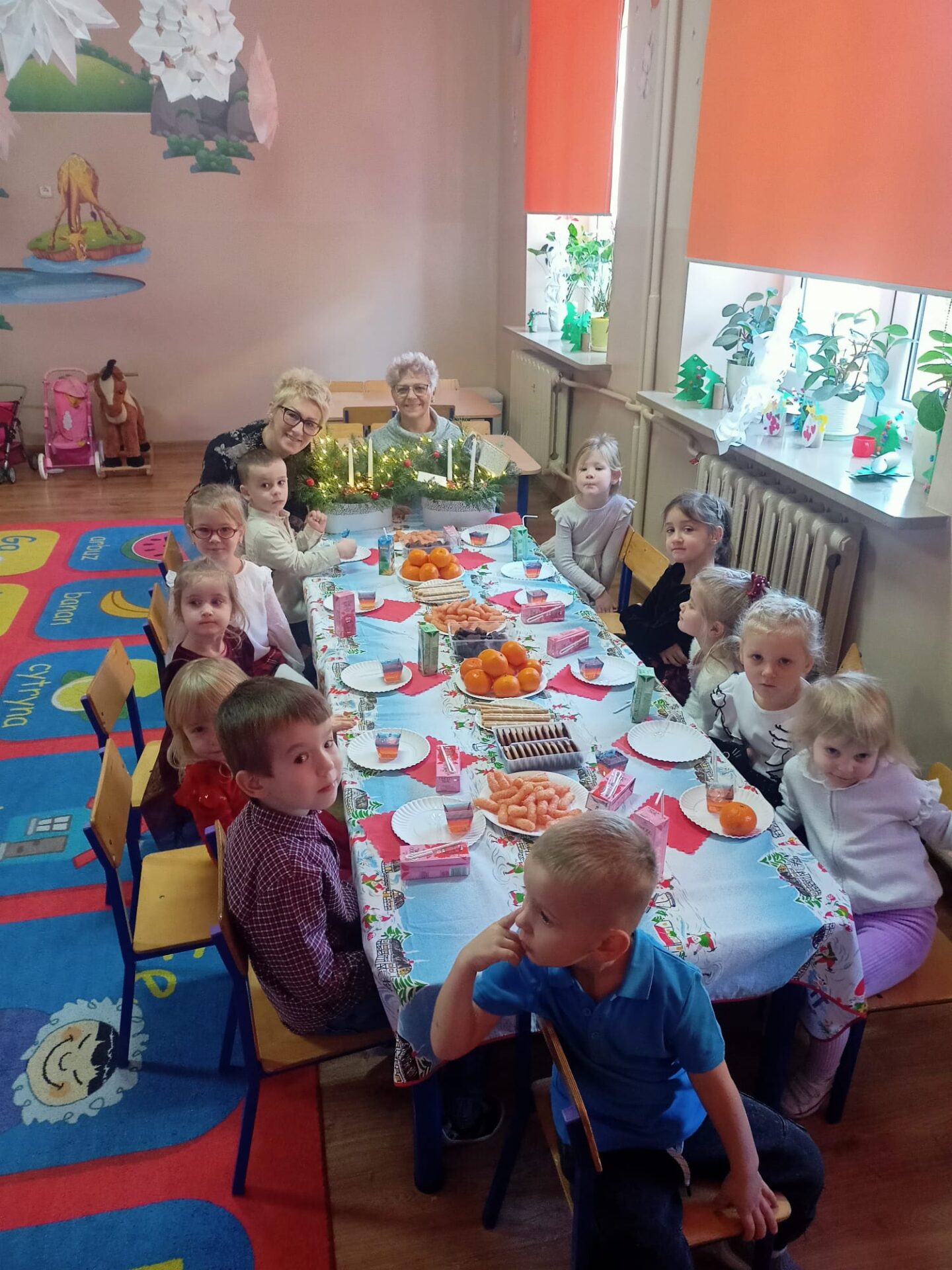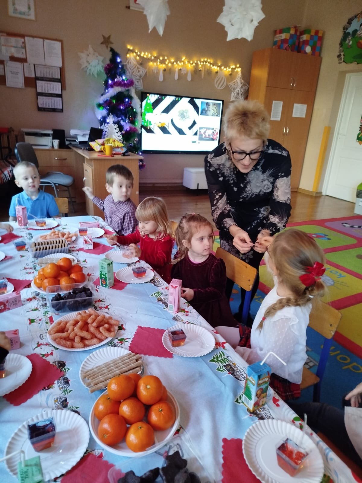 19 grudnia w naszym przedszkolu obchodziliśmy jeden z najpiękniejszych dni w roku – Wigilię Bożego Narodzenia. W sali przedszkolnej dzieci dzieliły się opłatkiem, składały sobie życzenia, a następnie zasiadły do pięknie przystrojonych stołów, na których czekał świąteczny poczęstunek oraz ciasteczka i owoce przyniesione przez rodziców. Nie zabrakło również wspólnego śpiewania kolęd i pastorałek.