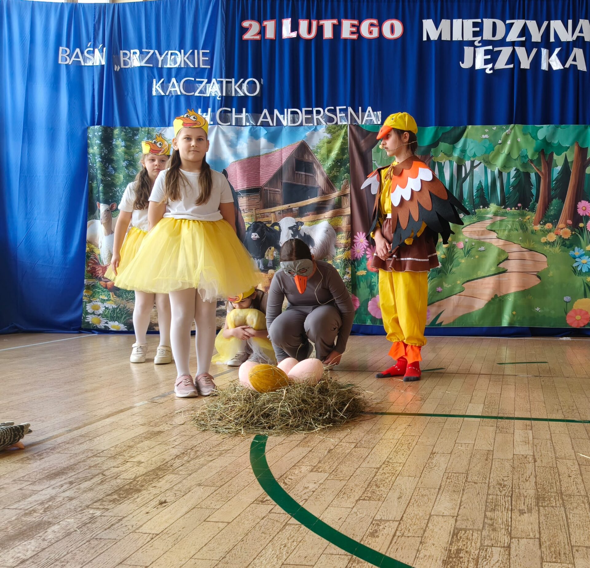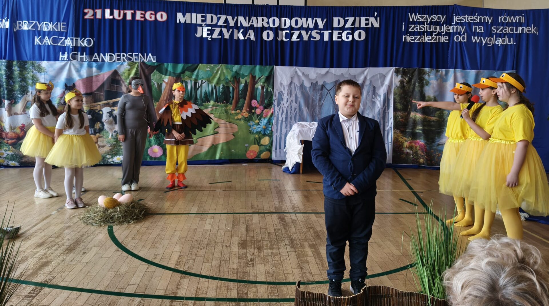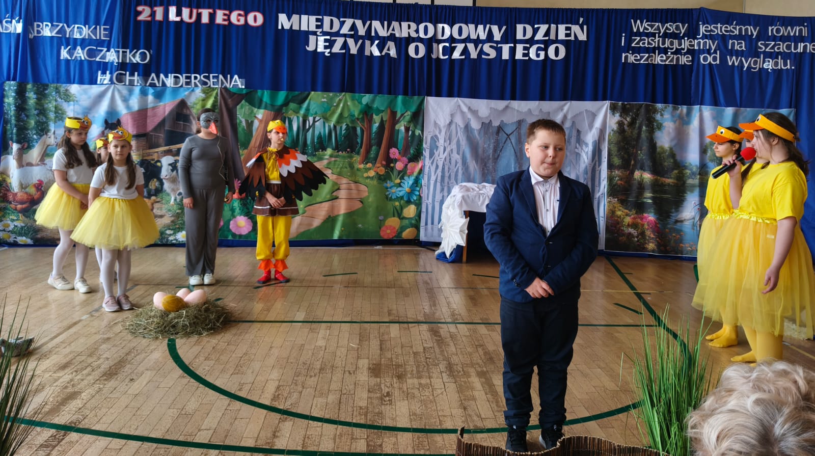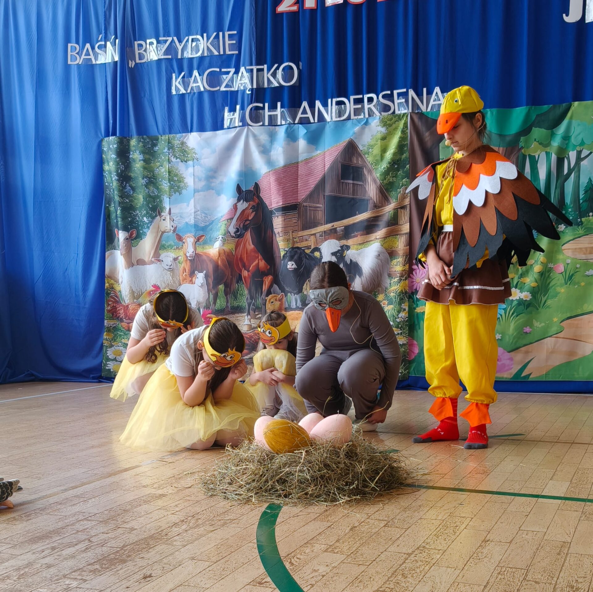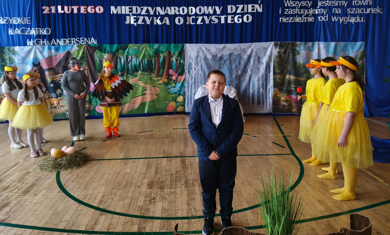 W ramach obchodów cała klasa 4 wraz z dziewczynkami z klasy 2 przygotowała przedstawienie pt. „Brzydkie kaczątko” na podstawie baśni Hansa Christiana Andersena. Młodzi artyści z ogromnym zaangażowaniem wcielili się w swoje role, dostarczając widzom wielu wzruszeń i radości. Spektakl przypomniał wszystkim, jak ważne są akceptacja, szacunek i wiara w siebie, a piękne, starannie wypowiadane słowa wybrzmiały ze sceny szczególnie donośnie w tym wyjątkowym dniu.