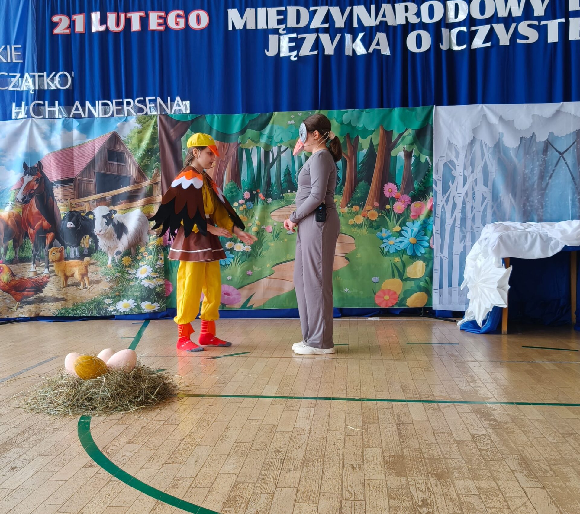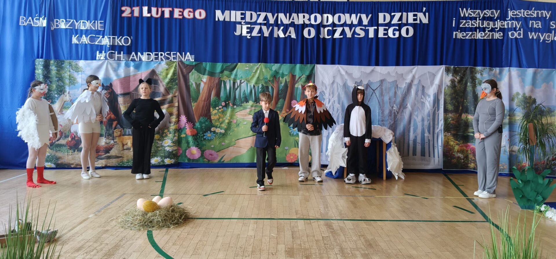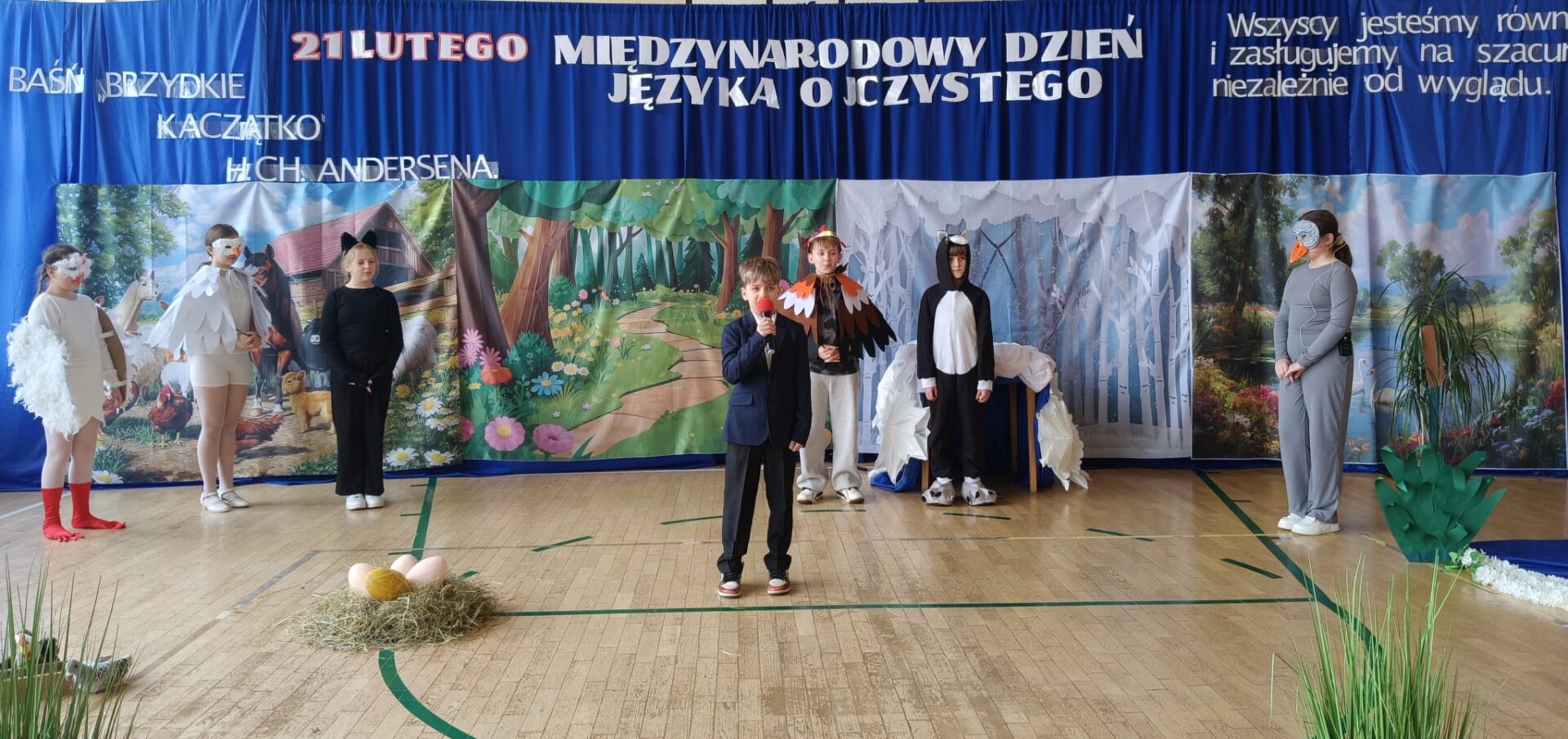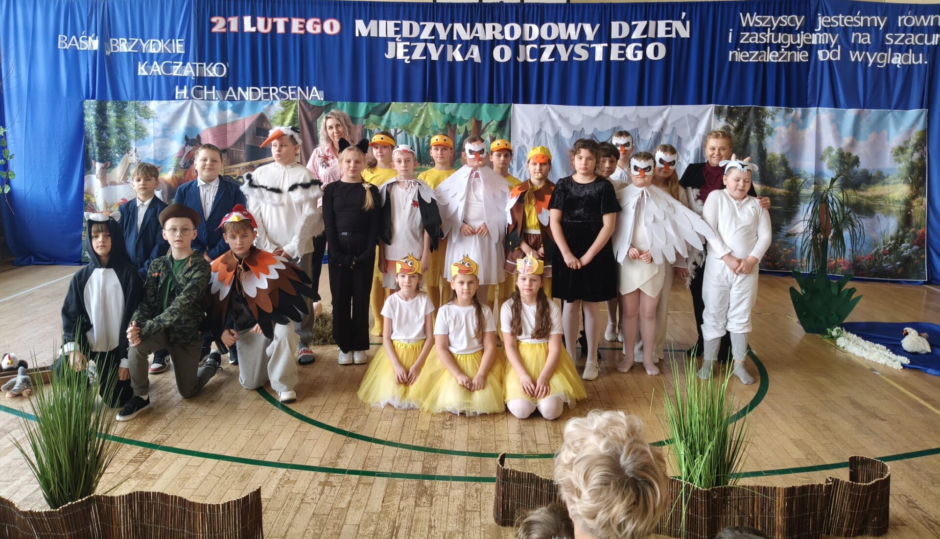 W ramach obchodów cała klasa 4 wraz z dziewczynkami z klasy 2 przygotowała przedstawienie pt. „Brzydkie kaczątko” na podstawie baśni Hansa Christiana Andersena. Młodzi artyści z ogromnym zaangażowaniem wcielili się w swoje role, dostarczając widzom wielu wzruszeń i radości. Spektakl przypomniał wszystkim, jak ważne są akceptacja, szacunek i wiara w siebie, a piękne, starannie wypowiadane słowa wybrzmiały ze sceny szczególnie donośnie w tym wyjątkowym dniu.