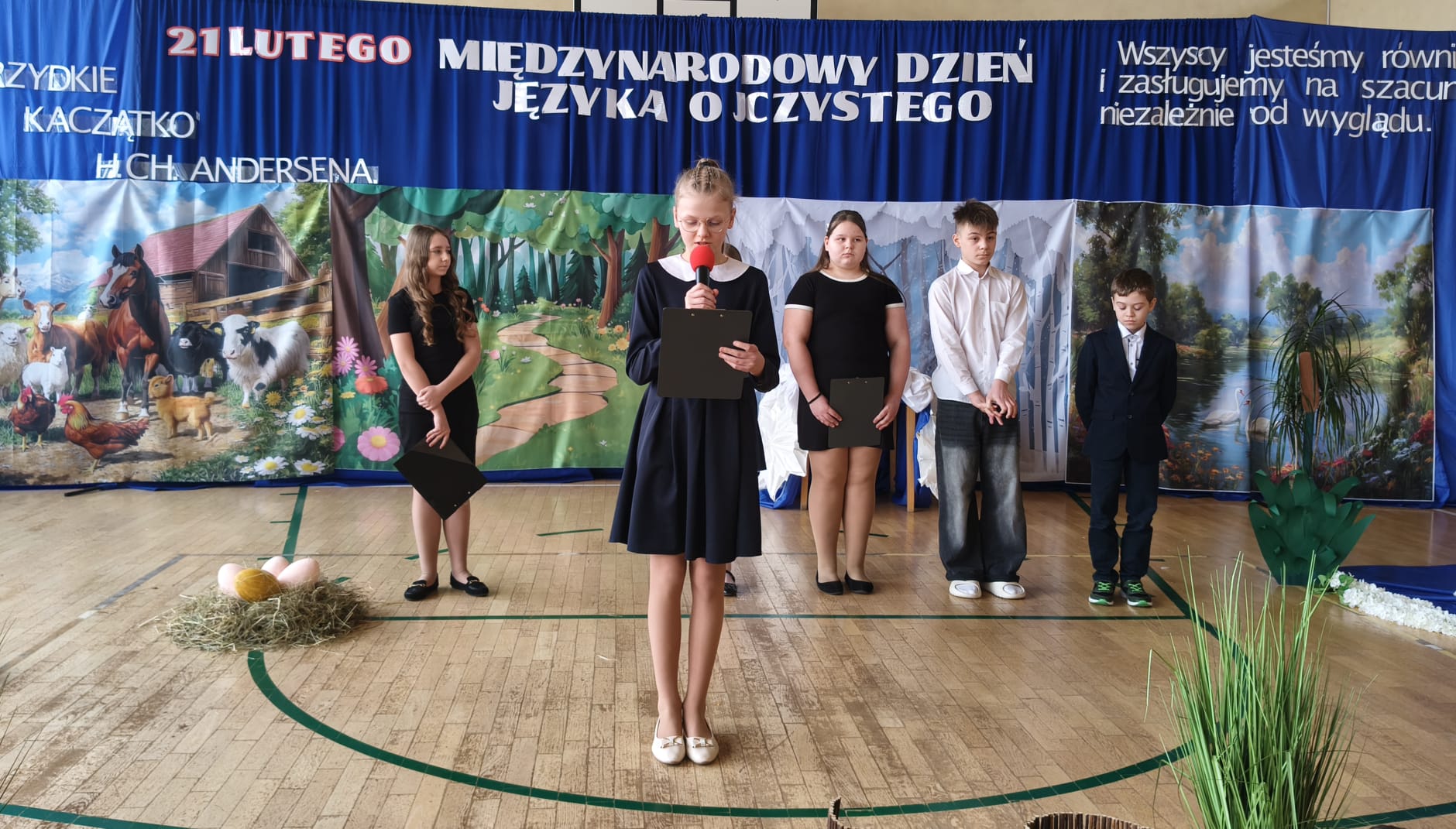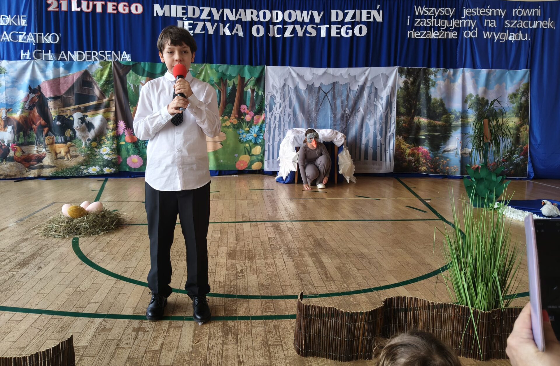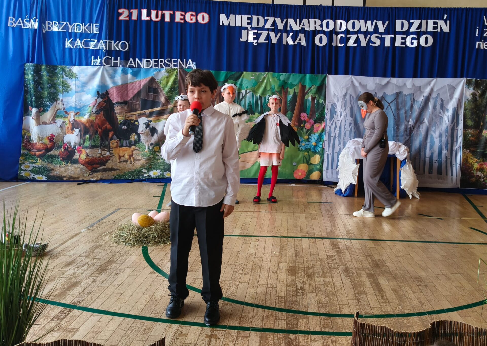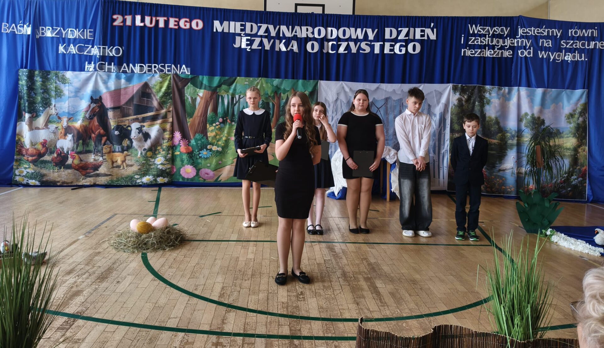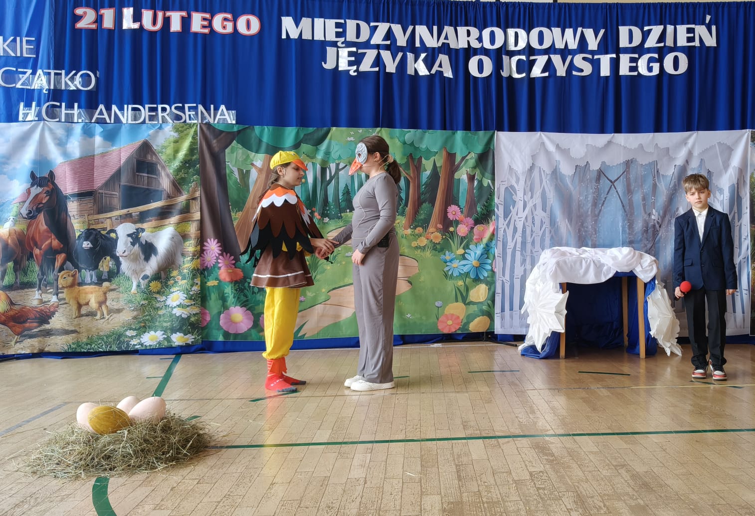 W ramach obchodów cała klasa 4 wraz z dziewczynkami z klasy 2 przygotowała przedstawienie pt. „Brzydkie kaczątko” na podstawie baśni Hansa Christiana Andersena. Młodzi artyści z ogromnym zaangażowaniem wcielili się w swoje role, dostarczając widzom wielu wzruszeń i radości. Spektakl przypomniał wszystkim, jak ważne są akceptacja, szacunek i wiara w siebie, a piękne, starannie wypowiadane słowa wybrzmiały ze sceny szczególnie donośnie w tym wyjątkowym dniu.